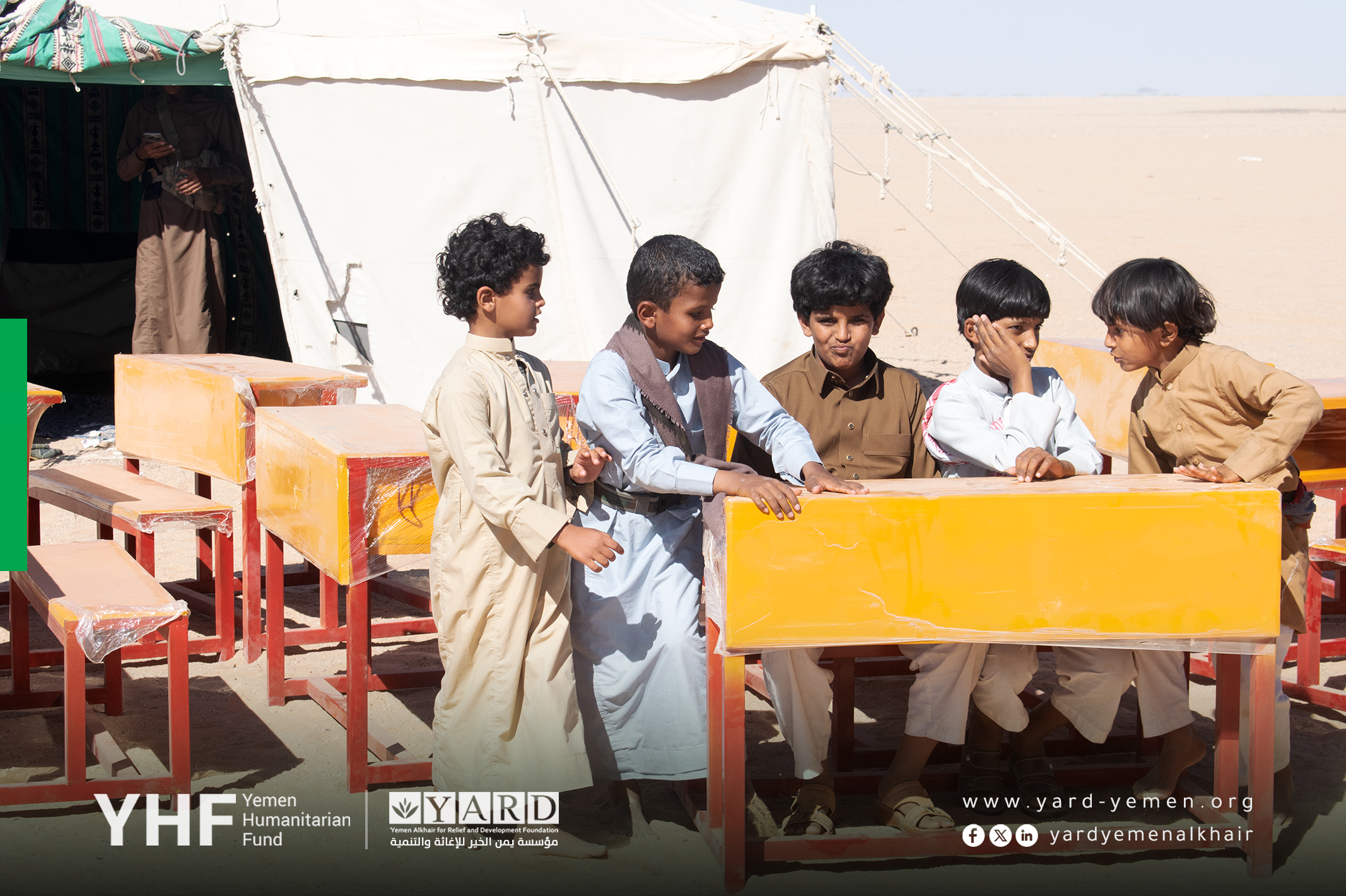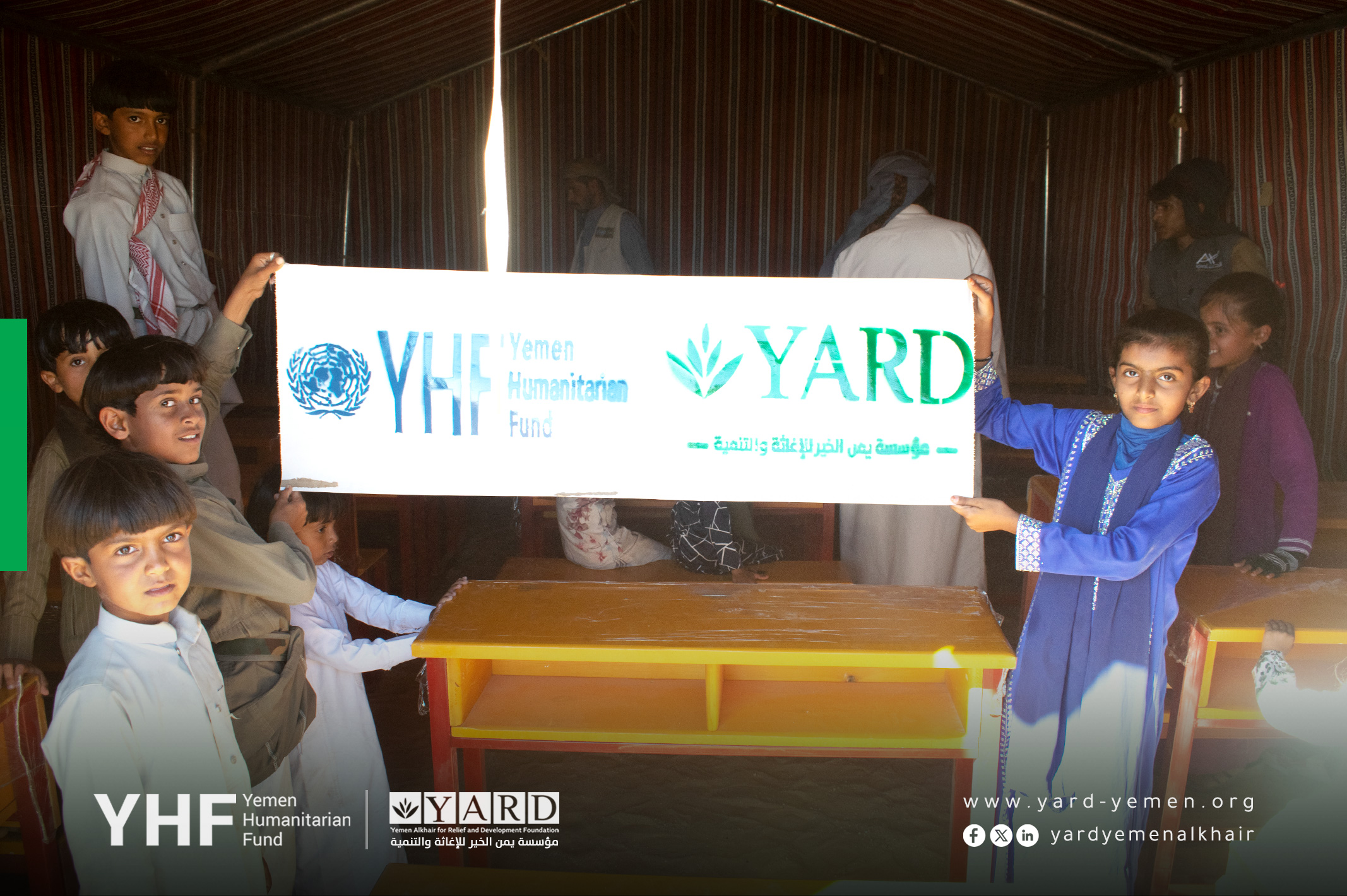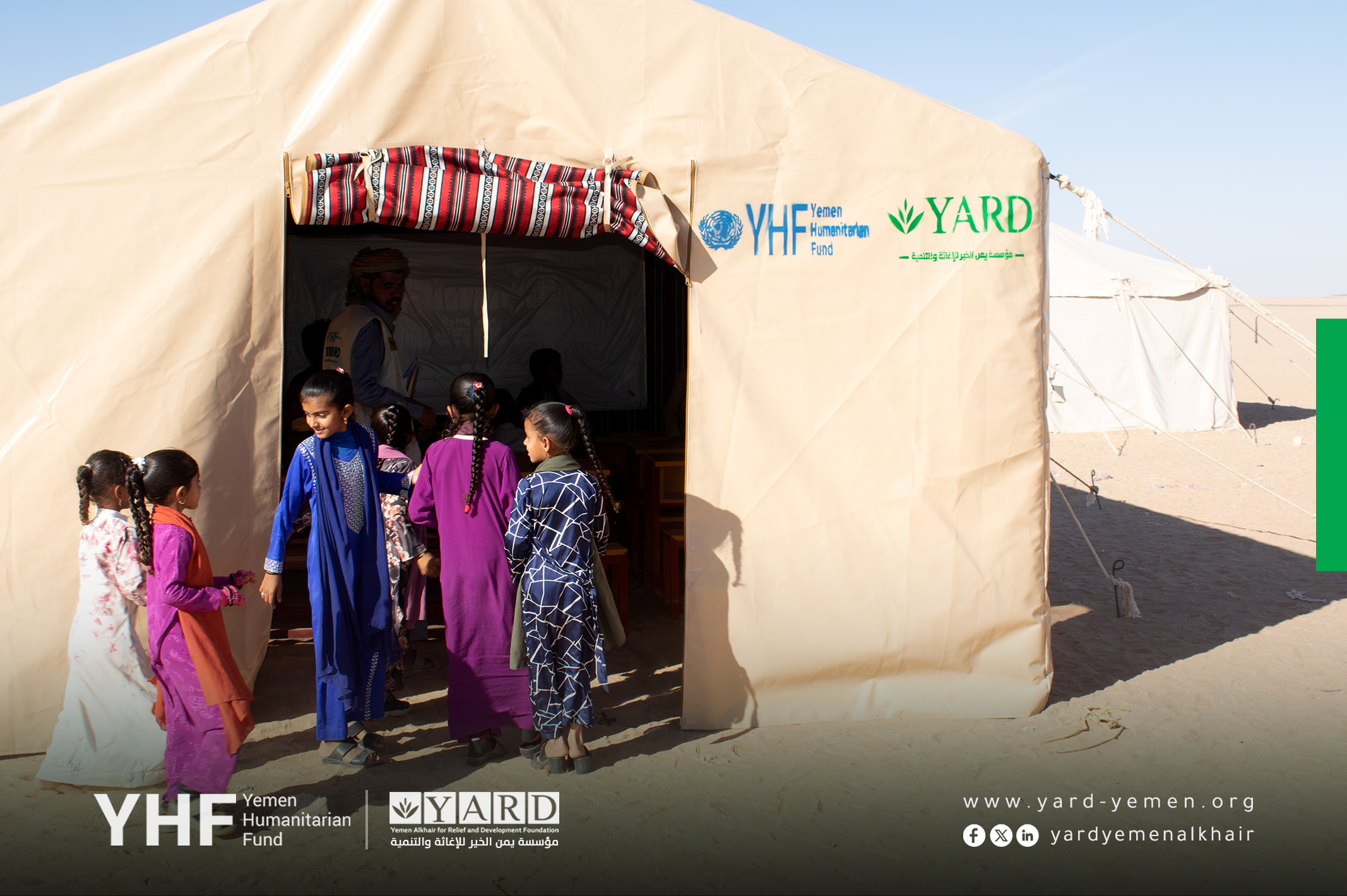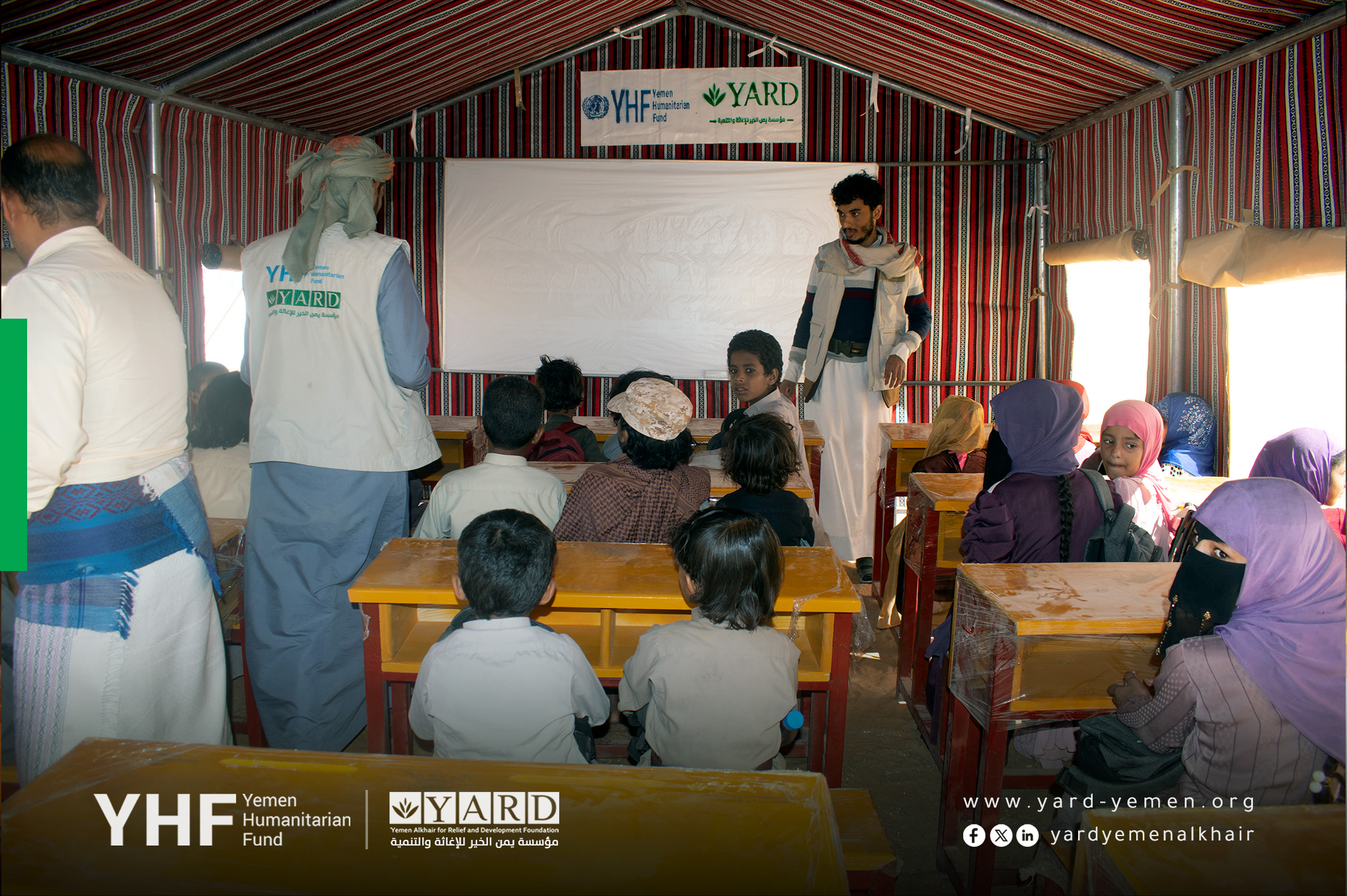 - Education: Establishment of 10 temporary learning spaces with furniture, two drinking units with water tank and pump, provision of 967 school bags, and 21 monthly incentives for teachers to ensure safe education for 967 students in Al Mohtafer.
